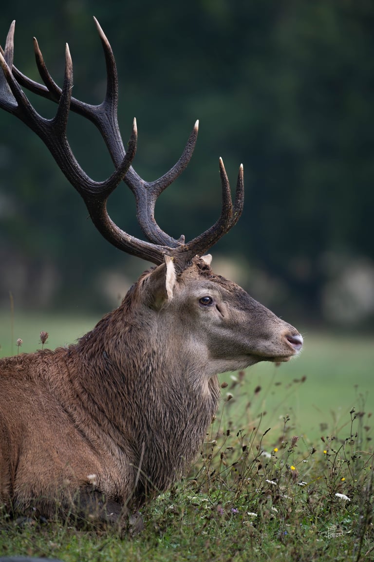 Un grand cerf s’était allongé dans l’herbe humide, le regard perdu vers la plaine. Ses bois, sombres et massifs, semblaient absorber la lumière. Il respirait lentement, dans cette posture de veille tranquille qu’ont les animaux qui n’ont plus rien à prouver. Autour de lui, la prairie appartenait au silence, à la paix fragile du matin.