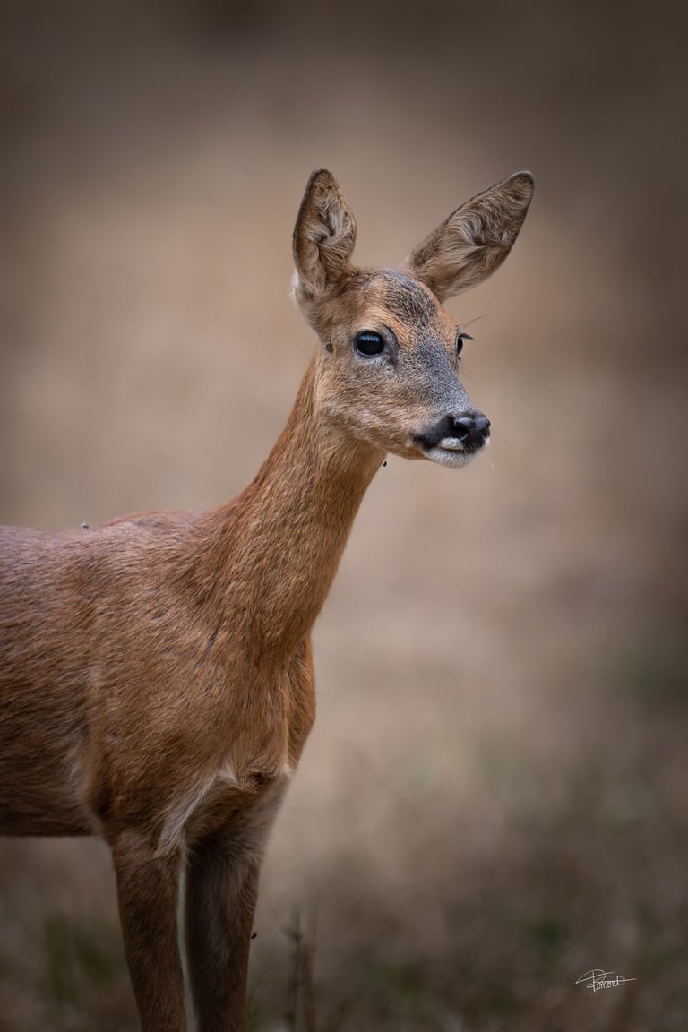 Le pari a été payant. Alors que le soleil déclinait, une chevrette est apparue, sortant des hautes herbes avec la légèreté de celles qui connaissent parfaitement chaque recoin de leur territoire. Elle s’est avancée doucement, sans jamais repérer ma présence. À un moment, elle s’est figée, le regard tourné vers un point plus loin dans la prairie. Du bruit venait de cette direction, j'avais également entendu ce bruit venir de la forêt mais j'étais concentré sur elle, jusqu'à ce que cela la face fuir, et la j'ai compris, une biche, un cerf et un faon venaient de sortir !