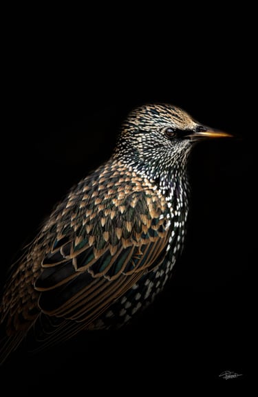 Durant un moment creux, cet étourneau sansonnet était là, assez curieux. Un simple petit oiseau au plumage sombre en apparence, mais qui, sous la lumière rasante du matin, révèle des reflets de cuivre, de vert et de violet, comme un bijou vivant. Il s’est posé sur la rambarde, juste à côté de moi, le regard vif et la tête légèrement penchée. Curieux, il m’observait presque comme si, cette fois, c’était lui qui menait l’observation.
