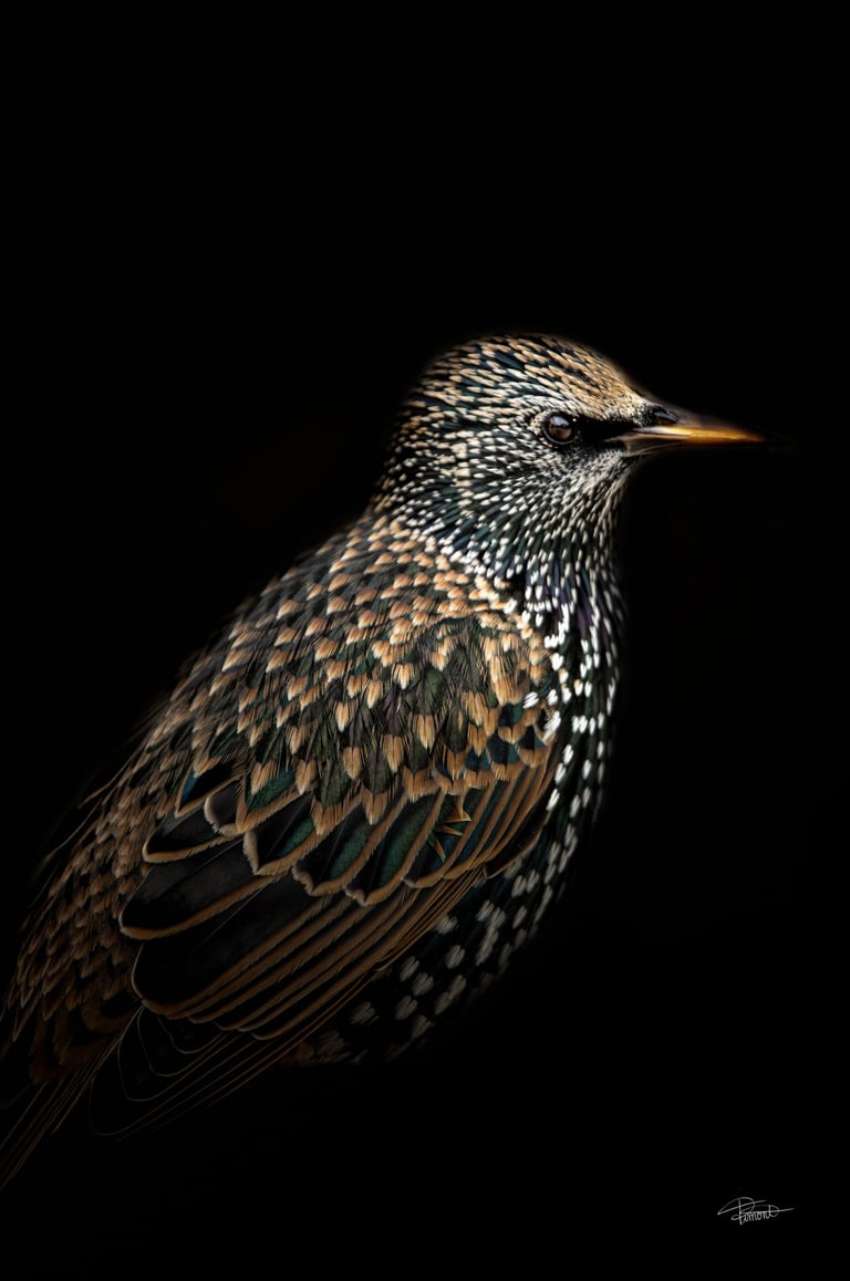 J’ai choisi de réaliser ce style de photo sur fond noir pour renforcer cette intensité : il symbolise la disparition progressive de nos milieux naturels, les habitats de tous ces animaux. Ce noir qui les enveloppe dans mes photos, c’est celui qui gagne du terrain, celui de la pénombre qui s’avance. Car peu à peu, ce sont eux que l’obscurité rattrape.