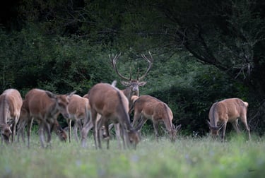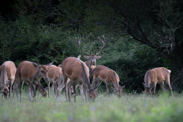 C’est là, entre ombre et lumière, que la forêt a laissé paraître son roi. Un grand cerf est sorti du couvert des arbres, précédé de sa harde. Les biches, absorbées par l’herbe tendre, broutaient sans se soucier de rien. Lui, dressé au centre du groupe, veiller sur elles, attentif à la moindre approche d'un autre mâle. Ses bois, vastes et puissants, se découpaient sur la pénombre du sous-bois comme une couronne d’ombres.
