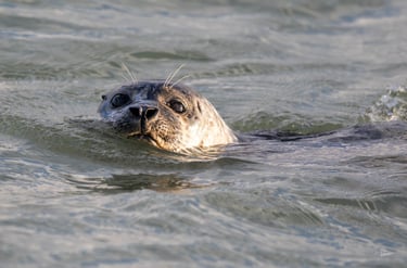 Mais c’est un autre habitant de la mer qui est venu à ma rencontre. À quelques mètres du bord, un Phoque veau-marin a surgi, la tête hors de l’eau, les yeux pleins de curiosité. Intrigué, il a commencé à me suivre le long de la digue, disparaissant sous la surface pour réapparaître un peu plus loin, comme s’il voulait s’assurer que je continuais ma route.
